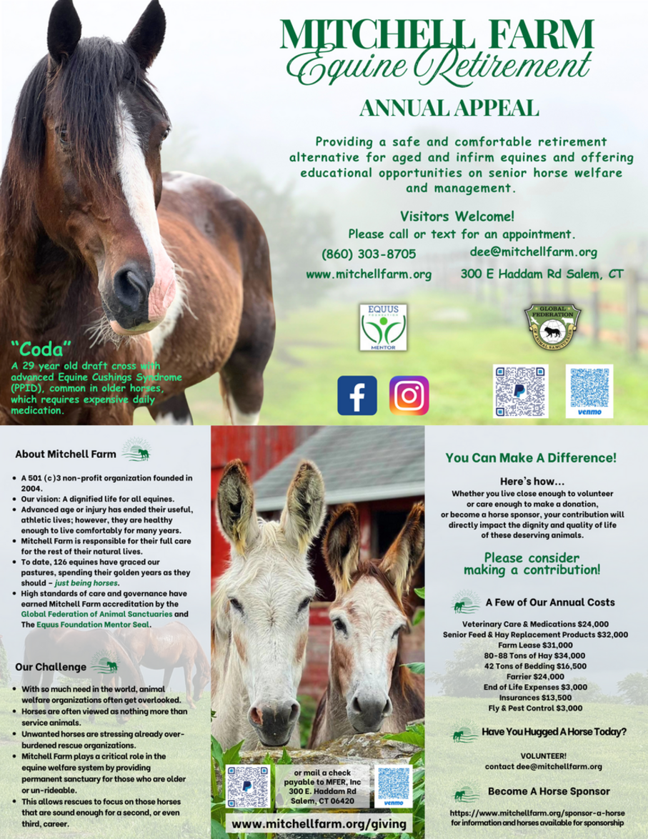 Mitchell Farm is a 501(c)3 non-profit equine sanctuary accredited by The Global Federation of Animal Sanctuaries and hold the Equus Foundation Mentor Seal. Every dollar really does count, and your direct donation is tax deductible. Whether you make a monetary donation, pick up something off of our Wish List, join The Harmony Legacy Society or volunteer, we thank you!